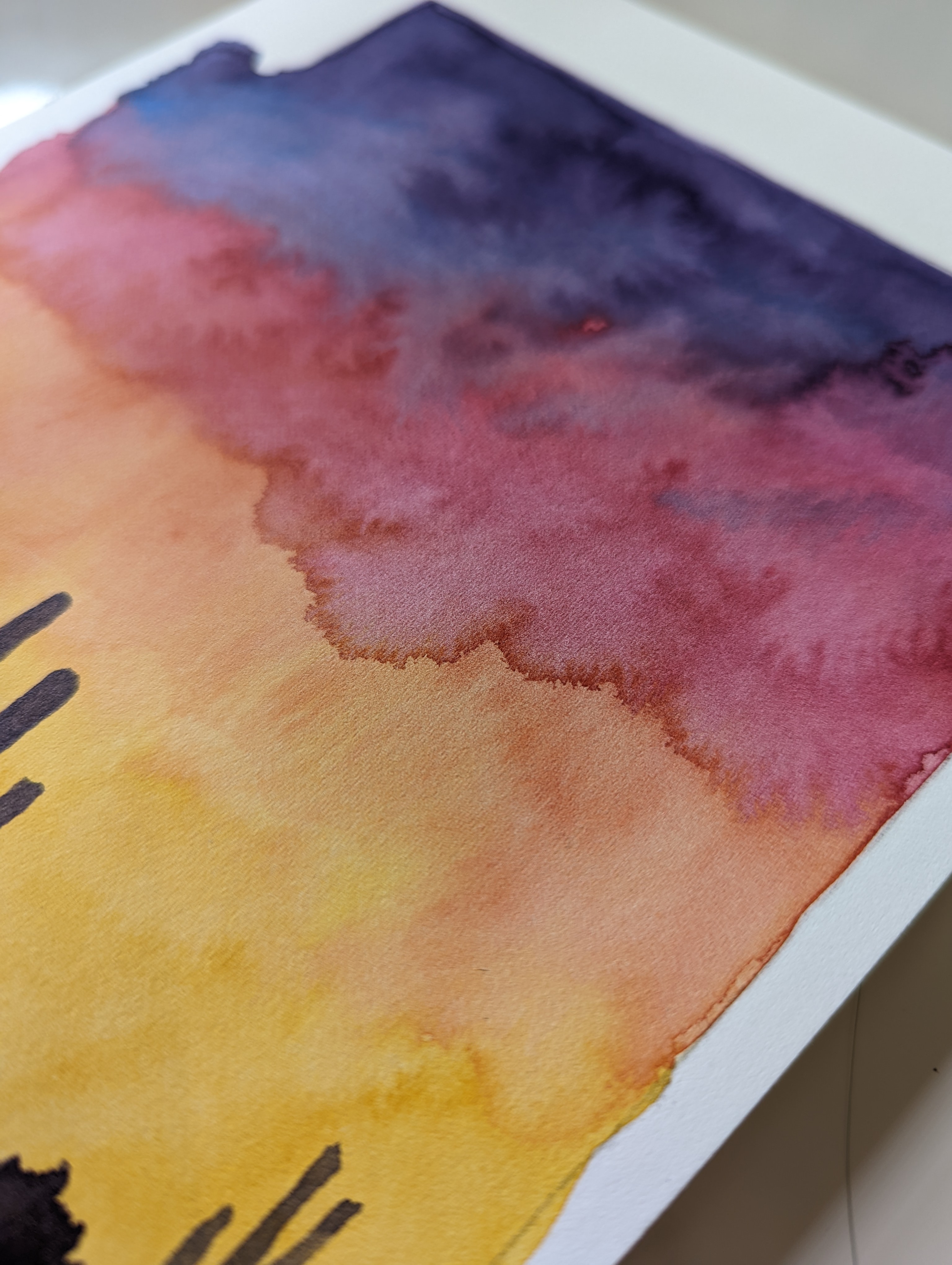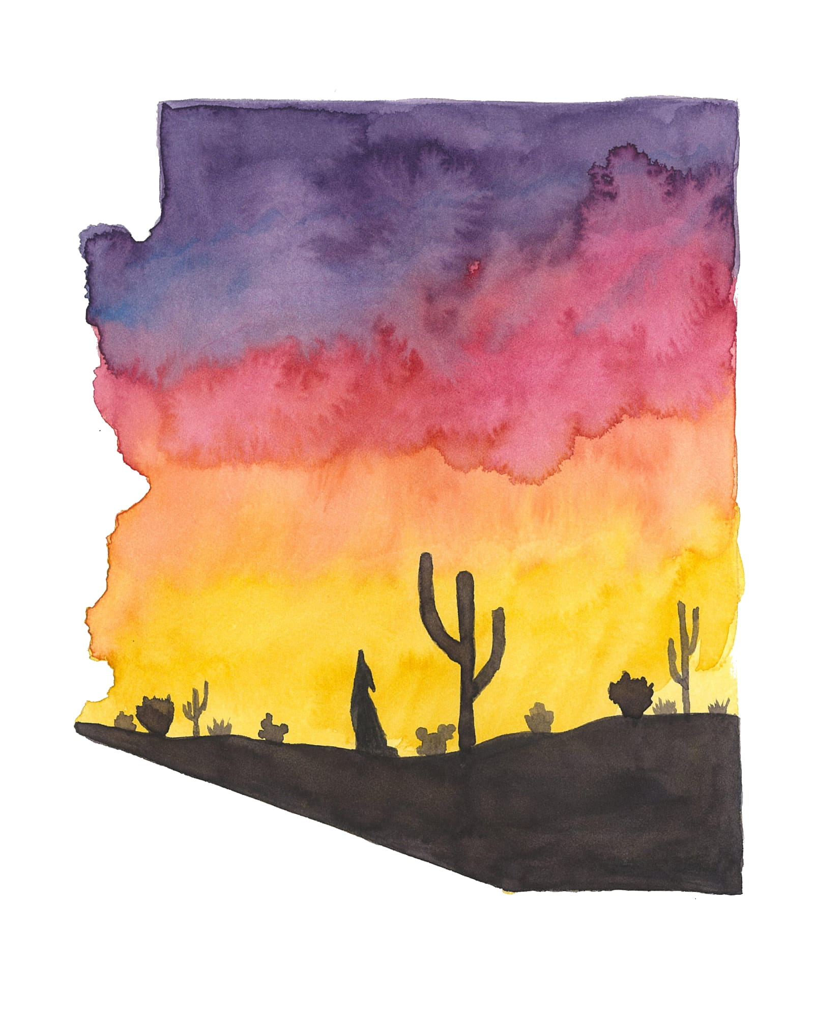 “Arizona Sunset” is a high-quality print of a handmade watercolor painting featuring a beautiful sunset in the shape of the state of Arizona with the silhouette of a desertscape and a coyote.